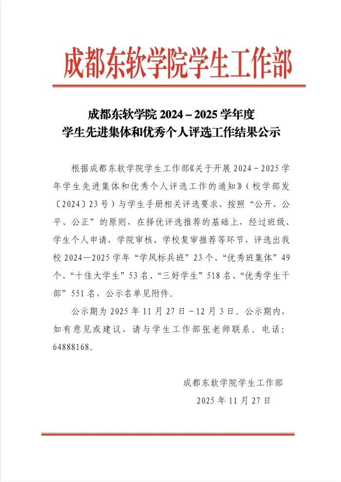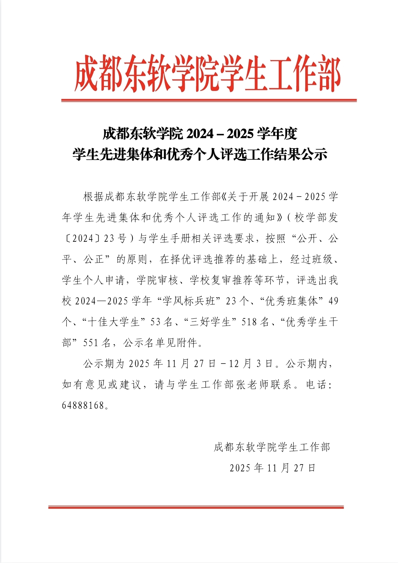 成都东软学院2024-2025学年度学生先进集体和优秀个人评选工作结果公示