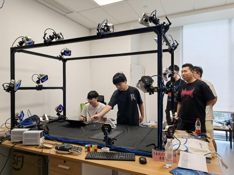 本次大赛分为CAIR-魔力元宝、具身智能光学动捕挑战赛、机甲新衣智能体创作等多个赛道。其中,“CAIR-魔力元宝”赛项以智能移动机器人应用为背景,综合训练学生人工智能以及机器人技术开发。我校参赛团队抵达比赛现场后,发现机器存在硬件损坏等问题,随即反复拆卸机器相应面板,全力排除硬件问题对比赛的影响。此外,“具身智能光学动捕挑战赛”聚焦具身智能与光学动捕技术前沿,重点考察参赛选手在光学动捕系统搭建与校准、具身智能机器人运动规划、实时数据交互与精准控制算法优化、多模块协同调试等方面的专业能力。我校参赛团队凭借扎实的专业功底与出色的团队协作,顺利完成复杂场景下光学动捕精度测试、机器人动态轨迹精准执行等挑战环节。