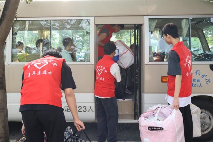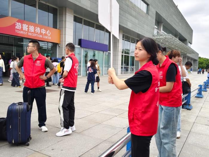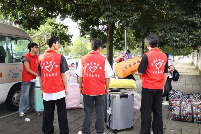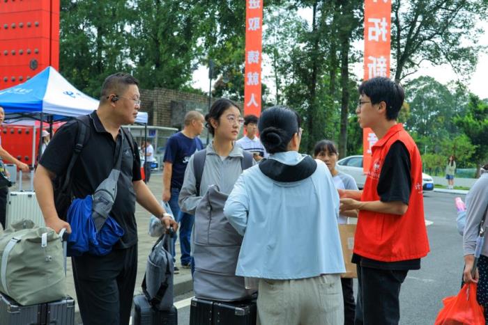 为确保新生顺利抵校,学校在青城山高铁站设立了迎新服务站。统一着装的志愿者团队高举指引牌,为新生提供出站指引、行李搬运及问题解答等温暖周到的服务,并协助他们有序搭乘前往学校的专车。同时,学校还调度多辆校车往返于车站和校园之间,全力保障新生与家长能够方便、安全地抵达学校。