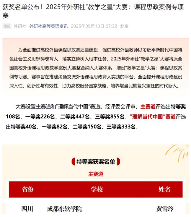 日前,2025年外研社“教学之星”大赛课程思政案例专项赛获奖名单公布。我校外国语学院教师团队表现优异,斩获全国特等奖1项、一等奖1项、二等奖3项、三等奖9项。
